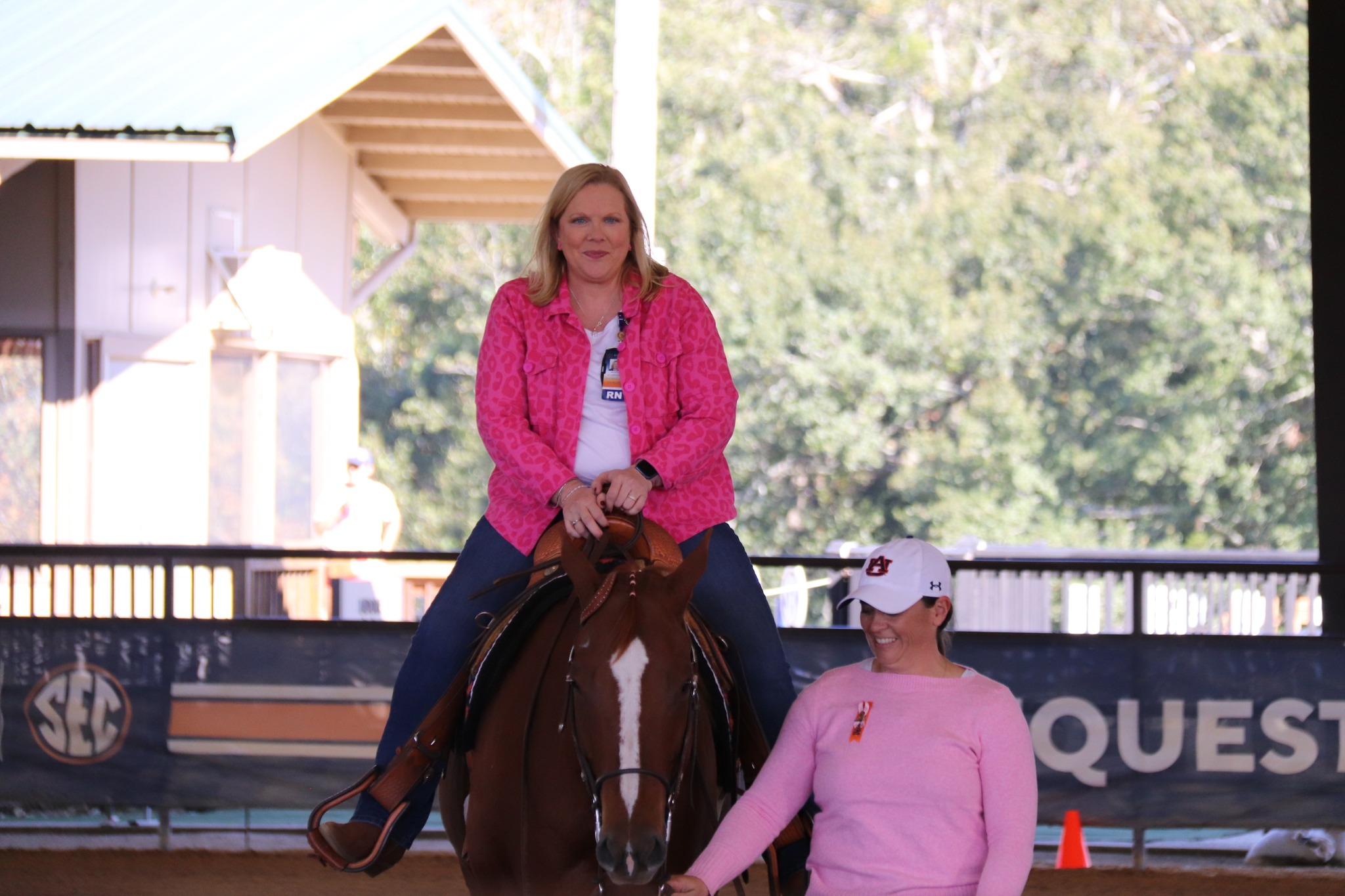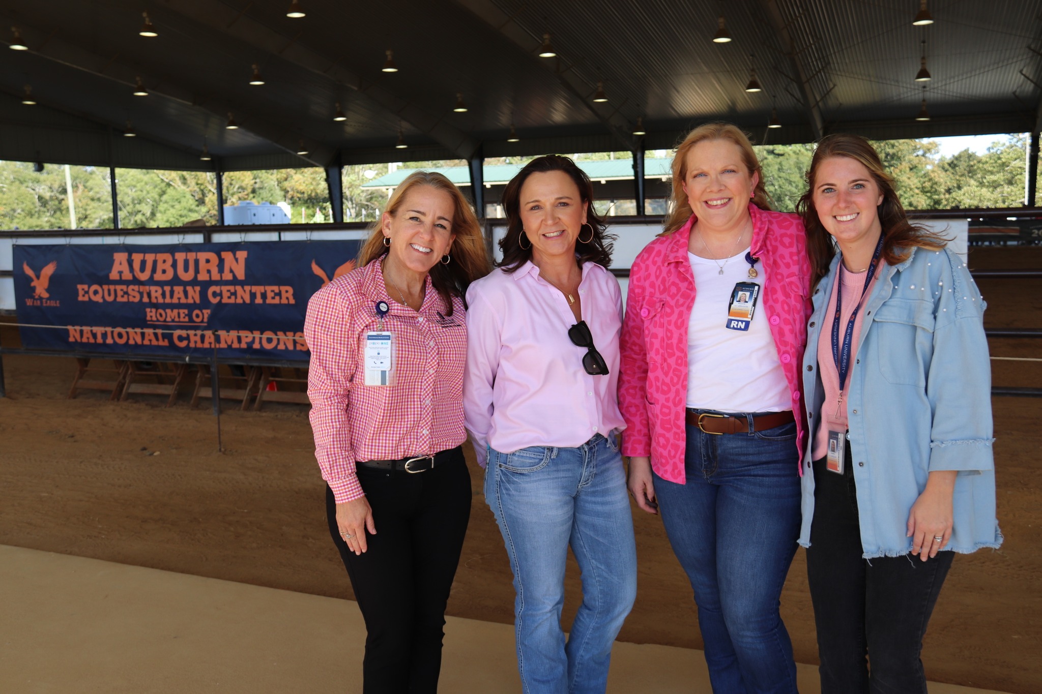 October 26, 2023At the Oct. 20 Auburn University Equestrian meet versus Georgia, Kim Scharf, RN, who works at our AU Medical Clinic, and is a 10-year breast cancer survivor, participated as the ceremonial first rider for the event. Sharf (second from right) is pictured with Tracy Shackett, Lisa Harmon and Alice Konstant.