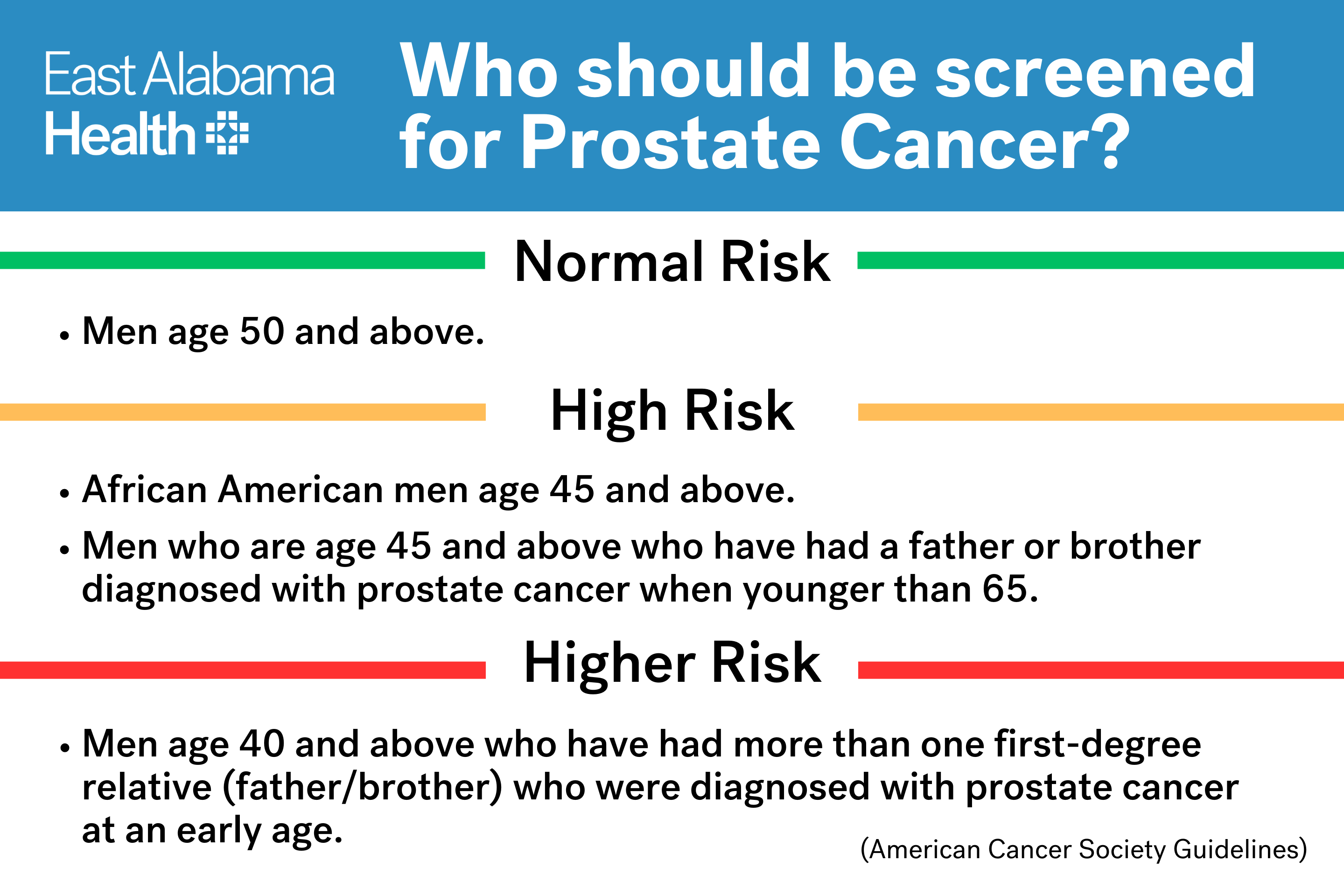 Screenings are recommended for men aged 50 and above who are at average risk of prostate cancer. African American men and men who have had a father or brother diagnosed with prostate cancer when younger that 65 are considered high risk and are encouraged to begin screenings at age 45. Lastly, screening is recommended beginning at age 40 for men deemed to be at an even higher risk, which is defined as having more than one first-degree relative who had prostate cancer at an early age.