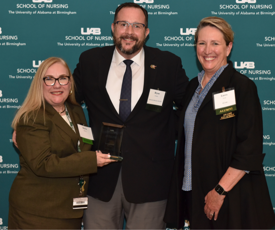 Pictured here presenting the award to Laura Grill (far right) are UAB School of Nursing Dean, Dr. Maria Shirey and UAB Alumni Board President, Dr. Bryan Combs.