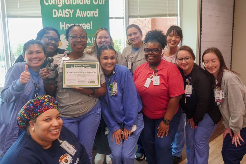 Karlee Smith, a PCU nurse at East Alabama Medical Center (EAMC), was recognized with a DAISY Award for her exceptional commitment to patient care. During a surprise ceremony held to present her award, coworkers shared nominations about how Smith's kindness, compassion and unwavering professionalism not only touches the lives of those she cares for but also create a positive ripple effect throughout their entire team.