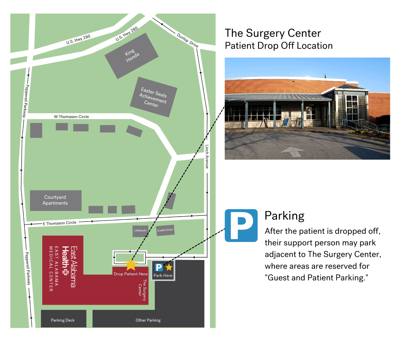 You may park in The Surgery Center parking lot in the rear of the hospital. At discharge, you will be transported to the patient pick-up area in the rear of the hospital, near the entrance to The Surgery Center.